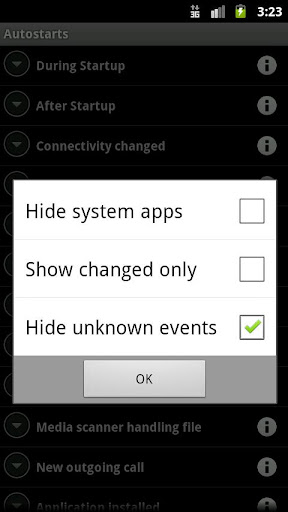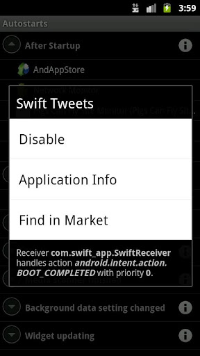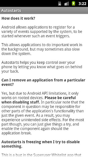 Shows you what apps run on phone startup, and what other events trigger in the background. Root users can disable unwanted autostarts and speed up their phone boot.