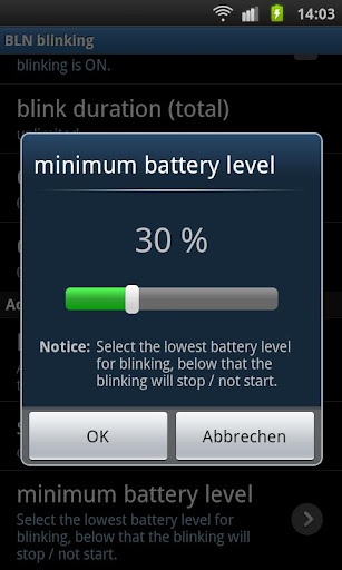 * hört auf zu blinken, wenn die Batterie unter eine wählbares %-Niveau sinkt