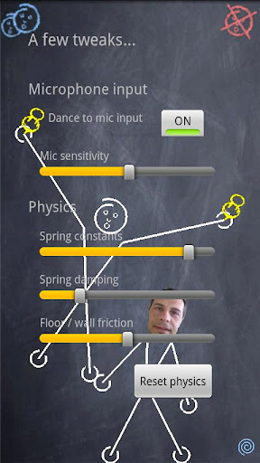 Chalky is a stick figure animated by simulated physics. Drag, pin, stretch, clone him and replace his face with your own. He also thinks he can dance and he'll start busting his moves if he detects music through your phone's microphone.