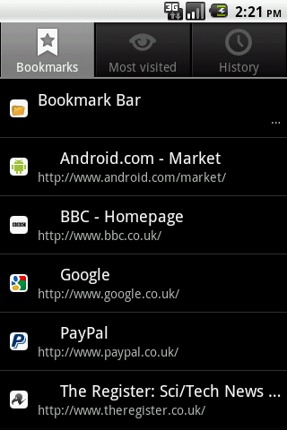 ✔ One-way integration with Stock Android Browser Bookmark Manager (* see below). You can use any Market Bookmarks widget to view your Chrome bookmarks.