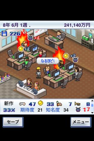 社員が育ってくると作れるゲームのジャンルと内容が増えます。人気の組合せを探り出し、新規ハードに参入しよう!プログラマーやサウンドクリエイターなどゲームに関わる職業システムも登場します。
