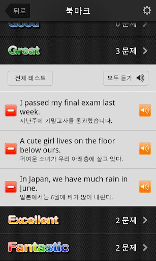 - 북마크 기능이 있어 원하는 문장을 최대 300개까지 따로 저장하여 집중 훈련할 수 있습니다. 조금이라도 맘에 걸리는 문장은 북마크하여 반복해서 도전하고 내 것으로 만듭니다.