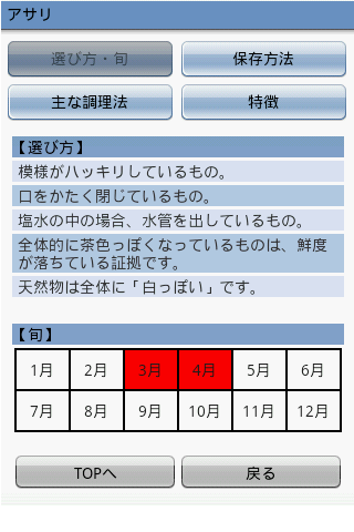 野菜・肉・魚の選び方・保存方法・効能など様々な情報を超簡単操作で一覧できるアプリです。