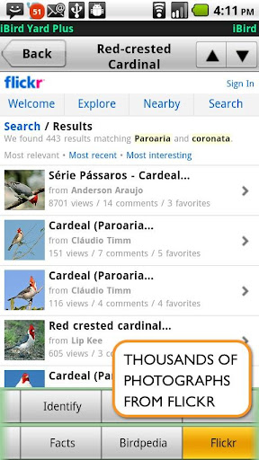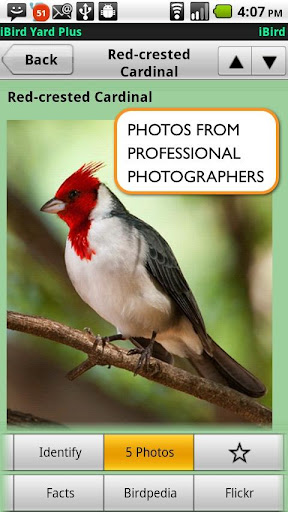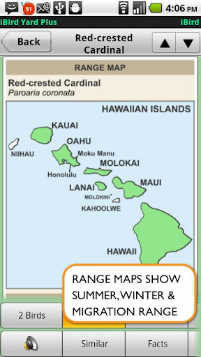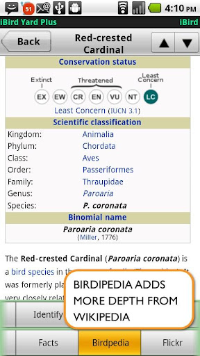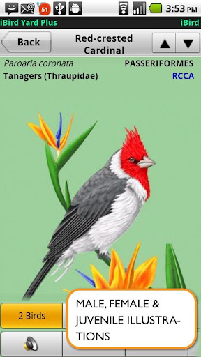 iBird Yard Plus: Macworld’s best reference app of 2009 comes to Android. Covers 234 species of North America, over 300 drawings, 500 photos, 60 minutes of song recordings from the Cornell Ornithology Lab. In depth descriptions, search engine to ID birds by color, shape, habitat, and more plus color range maps & lifetime updates.