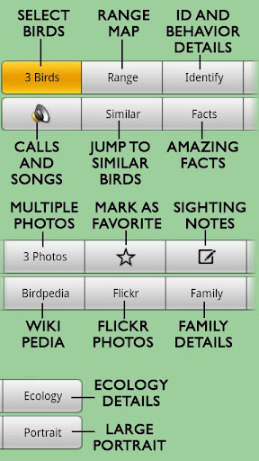 ■ Icon-driven search engine, enables you to identify birds using shape, color, location, habitat, head pattern, flight pattern, bill shape, length and more