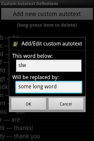 - Custom Autext: define specific key sequence to automatically expand into specific words/phrases