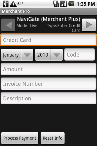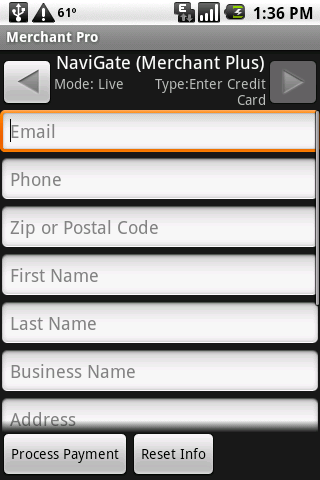 Use your phone and merchant account to accept your customer's credit cards. No more bad checks, enter info and get paid. Works anywhere with network connection.