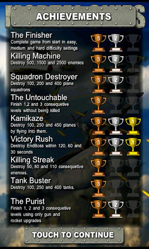 - Awesome Achievement missions: Earn Bronze, Silver and Gold cups for each of the 9 different achievement missions. Different achievements require different gameplay tactics, so you will be challenged to keep playing. Unlock extra planes and an extra bonus level in which you will be given some really awesome firepower.