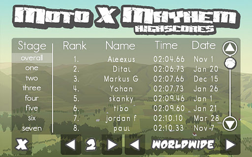 Verwende die Beschleunigungssensor- Technologie, um Dein Motorrad im Gleichgewicht zu halten, während Du über riesige Rampen fährst und springst! Genieße realistische Physics und spüre die Bewegung der Stoßdämpfer, wenn Dein Fahrer herunter fällt oder Du einen Unfall baust. Messe Dich mit dem schnellsten Motocross-Fahrer über die Internet-Bestenliste von Moto X Mayhem.