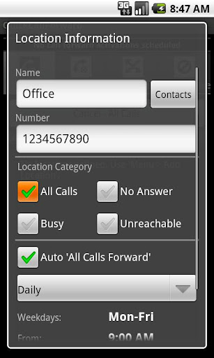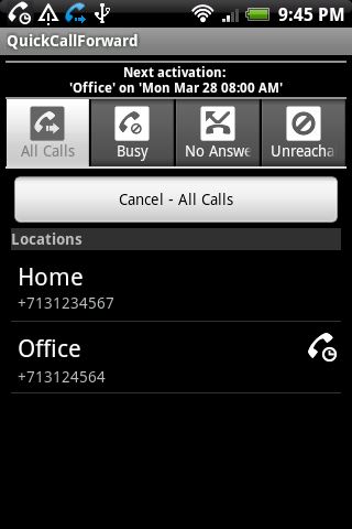 * Create multiple call forward locations (home, office, etc.) and assign them to any or all of four call forwarding types