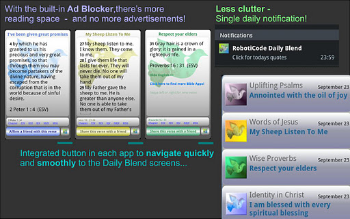 Daily Blend also adds a button into each Daily Quote app to allow you to navigate quickly and smoothly to the Daily Blend screens and between all your quotes or verses easily.