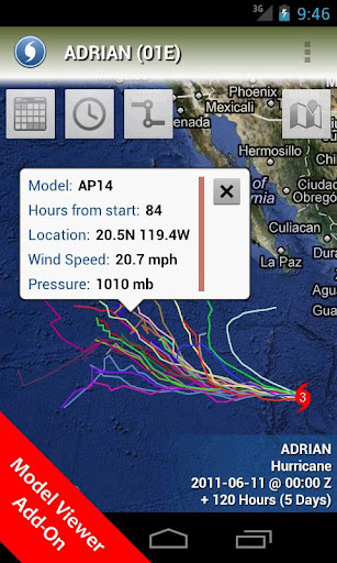 - Optional Forecast Model Viewer Add-On: View forecast models (also known as spaghetti models) for active systems on an interactive map complete with panning, zooming, and individual model point information when tapped. Features selectable models, start time, and run length.** (See http://www.nhc.noaa.gov/modelsummary.shtml for more information on forecast models)