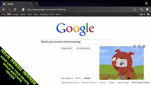 Stick it! is the only video player of its kind : it can live on top of your screen, above any of your other applications and allow you to use your device’s other features (browsing, emailing, texting...) while watching your favorite movie! Impress your friends with the MultiView™ feature !