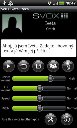 Have Iveta read aloud texts from your e-book, navigation, translation and other apps in a female Czech, high quality and natural-sounding voice powered by SVOX.