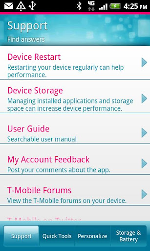 • Access support information and troubleshooting tools—tap ‘Menu’ button on your device, and then select “My Device”.
