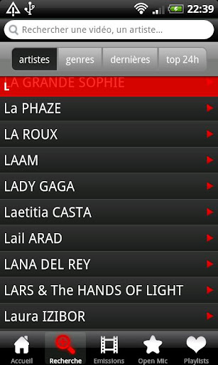 * RECHERCHE : recherchez des artistes comme dans vos contacts. Accédez à une recherche par genres musicaux, les dernières vidéos et les plus vues sur 24 heures.