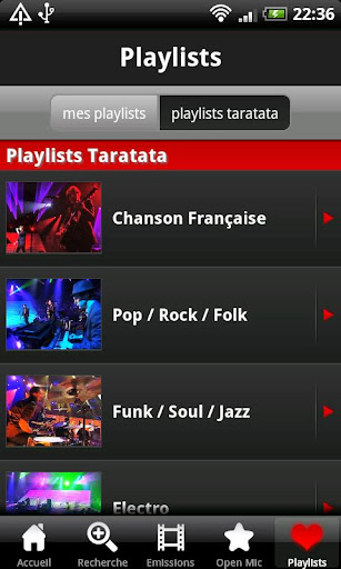 * PLAYLISTS : créez et gérez ici vos propres playlists et accédez aux playlists Taratata générées par genres et à écouter en continu.