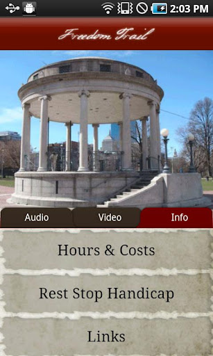 Tour Boston's Freedom Trail App is jam packed with content including full audio, HD video footage, GEO location and maps, thorough historical information about each of the sites, and important details such as public restroom locations, handicap accessibility, contact information and hours of operation.