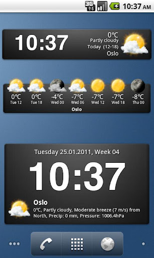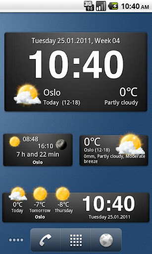 18 fantastic weather widgets in 3 different sizes. Widgets with and without a clock. Widget displays weather forecasts for coming periods, up to a week ahead.