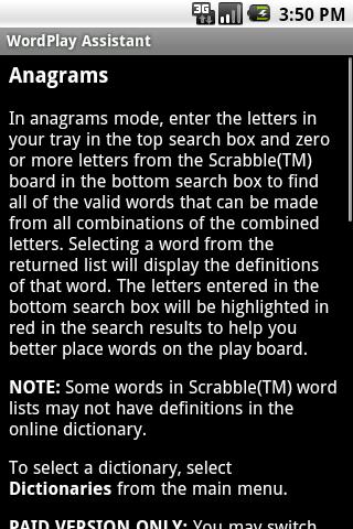 Enter your tiles in the text box at the top (using question mark “?” for blank tiles) and then drag letters down onto the board image to duplicate a current board you would like to solve. Long press on a placed letter to remove it from the board. Press the solve button. The top results and their point values will appear in a horizontal scrolling list near the top of the screen. Press any result to see its position on the board. Long press on a result to see the definition for that word. Use the menu button to manage multiple boards (new, open, save, delete) or to switch the game type. The free version is limited to only 15 letters allowed on the board you are solving and the top 3 results are hidden. The paid version removes these limitations. Screenshot input to the board solver may be possible in future releases once screenshot support is added to more Android devices.