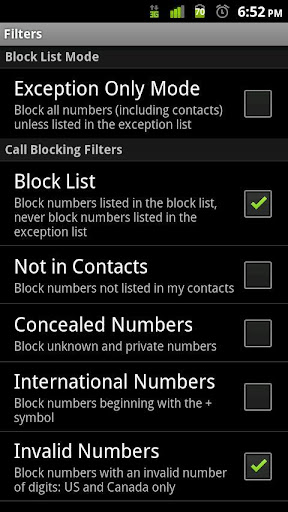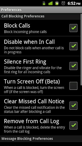* Silence First Ring - Silence the ringer and vibrate for incoming calls, then un-silence if the call is not blocked. This will reduce or eliminate ring and/or vibrate time for incoming calls that are blocked.