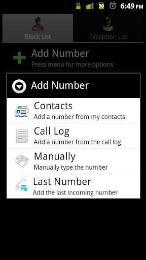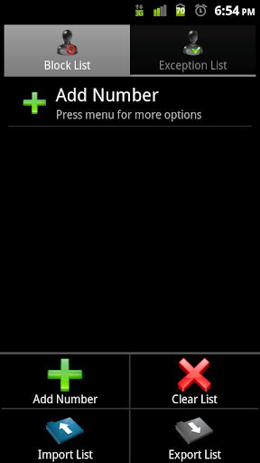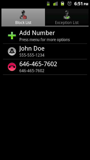 * Exception List - Allow specific numbers. Can switch modes and block all numbers except the ones in your exception list.
