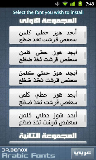 This application allows you to easily change your rooted android's Arabic font. After applying a font, you MUST reboot your system.