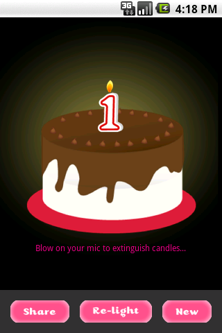 Create custom birthday cakes! Choose the flavor, frosting, toppings and candles. Then blow out the candles!