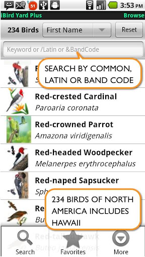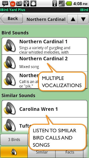 iBird Yard Plus: Macworld’s best reference app of 2009 comes to Android. Covers 234 species of North America, over 300 drawings, 500 photos, 60 minutes of song recordings from the Cornell Ornithology Lab. In depth descriptions, search engine to ID birds by color, shape, habitat, and more plus color range maps & lifetime updates.