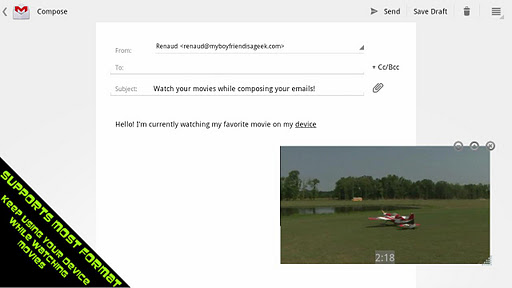 Stick it! is the only video player of its kind : it can live on top of your screen, above any of your other applications and allow you to use your device’s other features (browsing, emailing, texting...) while watching your favorite movie! Impress your friends with the MultiView™ feature !