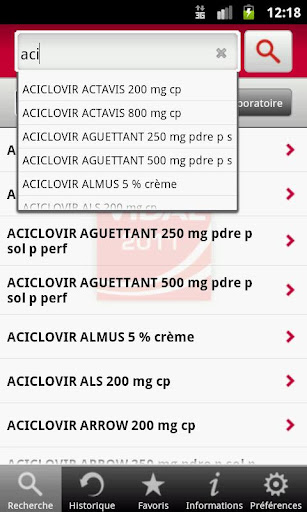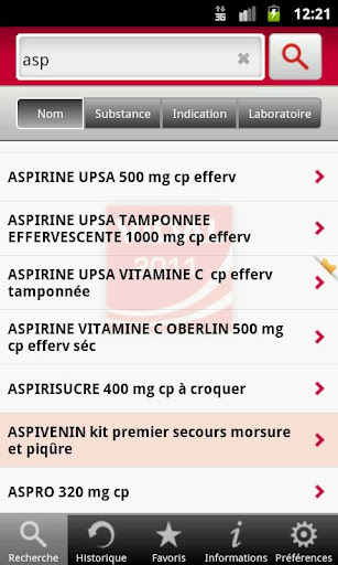 - 4 modes de recherche, autorisant les synonymes et abréviations : par nom de produit, par substance, par indication, par nom de laboratoire pharmaceutique